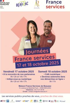 À l’occasion de l’événement national des Journées France Services, l’équipe de la Maison France Services de Beauzac vous invite à ses portes ouvertes qui auront lieu les 17 et 18 octobre 2025.