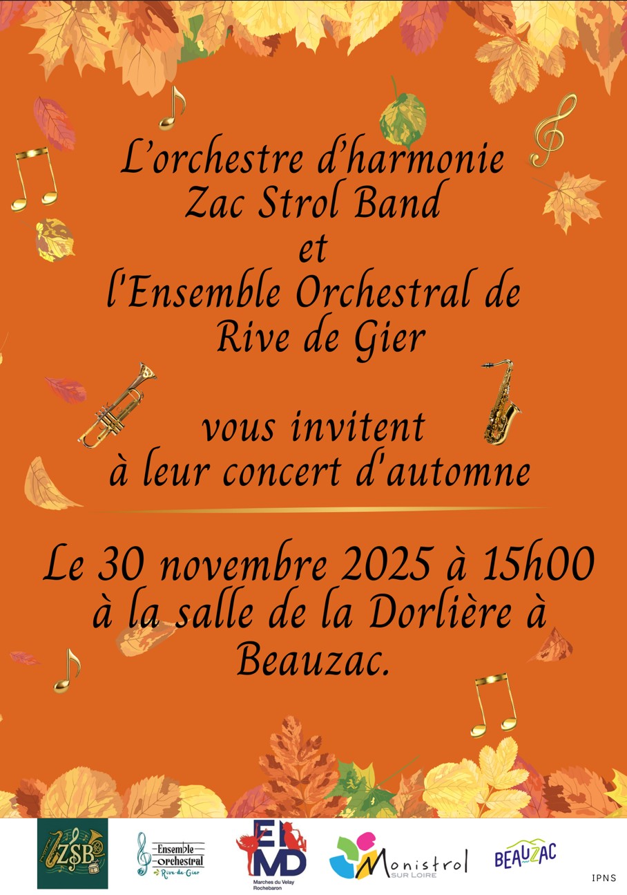 Les amateurs de musique seront à la fête . L'orchestre d'harmonie monistrolien, le Zac Strol Band, aura le plaisir d'accueillir l'Ensemble Orchestrale de Rive de Gier pour un grand concert commun.