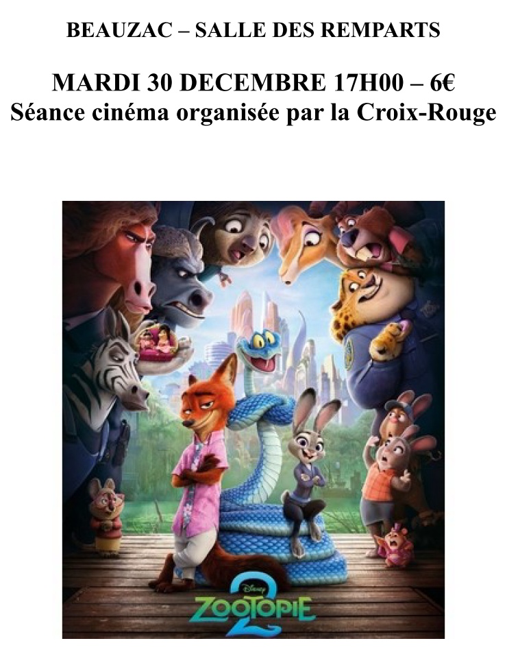 Vous êtes ici : Accueil > MARDI 30 DECEMBRE 17H Séance cinéma "Zootopie 2" organisée par la Croix-Rouge – SALLE DES REMPARTS