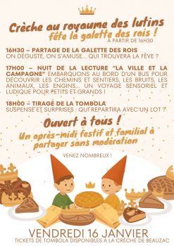 Vous êtes ici : Accueil > vendredi 16 janvier après-midi et fin de journée festive et familiale, ouverte à tous, autour de la galette des rois organisé par la crèche de Beauzac – Le Royaume des Lutins.
