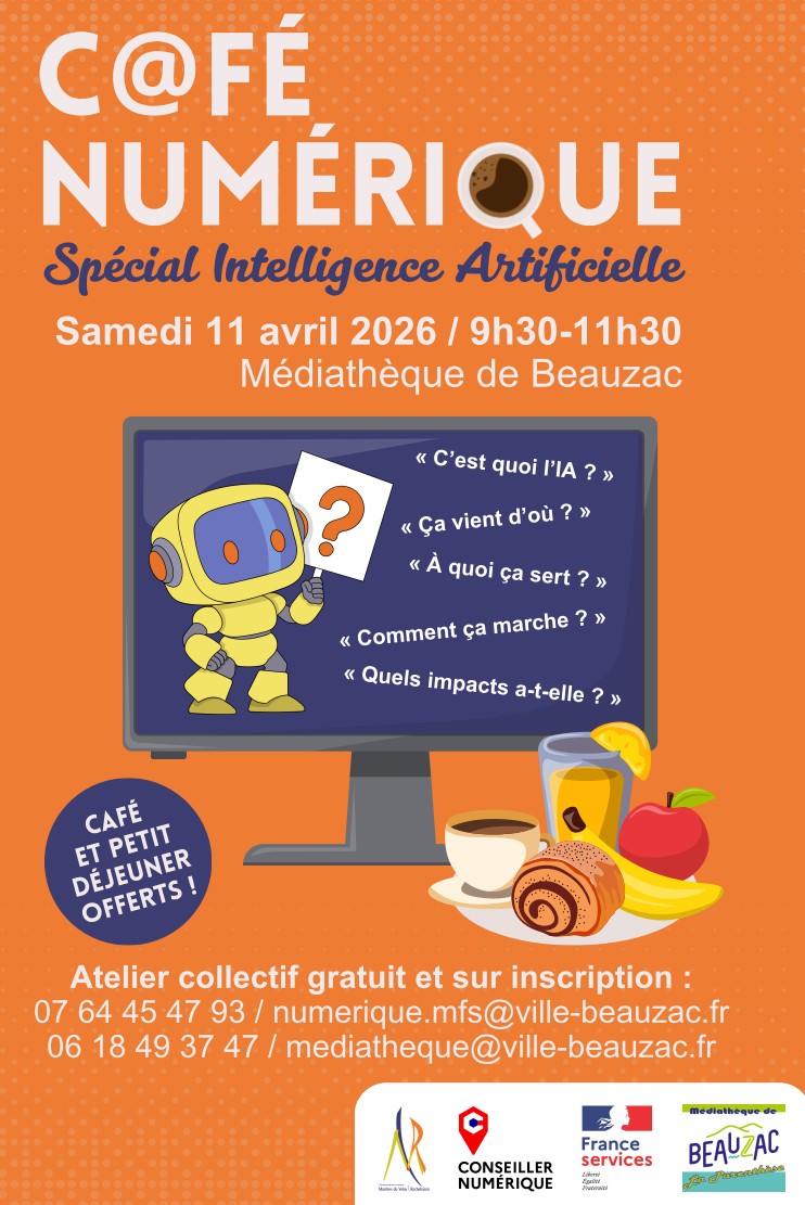 C@fé numérique ! La Communauté de Communes Marches du Velay-Rochebaron et la Maison France Services de Beauzac organisent la Semaine Digit’all du 7 au 11 avril 2026 ! Vous vous posez des questions sur l’IA ? • C’est quoi ? • Ça vient d’où ? • À quoi ça sert ? • Comment ça marche ? • Quels impacts a-t-elle ? Médiathèque sur inscription 0471615034/0618493747 Ou MFS 07 64 45 47 93 |